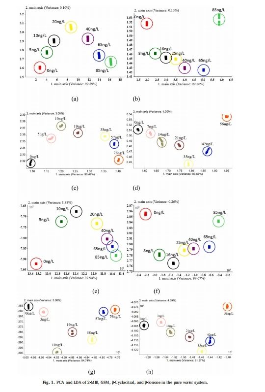 圖 1(e)、(f)、(g)和(h)展示瞭(le)純(chún)水中 2 - 甲基異冰片、土臭素、β- 環檸檬醛和 β- 紫羅蘭酮的線性判别分析(LDA)結果。樣本之間相隔一定距離,兩個樣本之間的距離越大,差異就越明顯。2 - 甲基異冰片、土臭素、β- 環檸檬醛和 β- 紫羅蘭酮的第一線性判别因子(LD1,x 軸)和第二線性判别因子(LD2,y 軸)占總方差的比例超過 99.00%。圖 1(e)顯示,在 0 到 40 納克 / 升的濃度範圍内可以區分 2 - 甲基異冰片,濃度在 40 至 85 納克 / 升的樣本與濃度在 5 至 20 納克 / 升的樣本可以區分開來,但濃度在 40 至 85 納克 / 升的樣本之間不能清晰區分,2 - 甲基異冰片的嗅覺阈值濃度爲 8.5 納克 / 升。從圖 1(f)可以看出,低濃度(8 至 16 納克 / 升)和高濃度的土臭素能清晰區分開來。