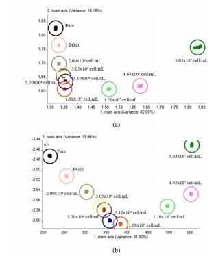利用電子鼻對銅綠微囊藻在 BG11 培養基中不同濃度下的氣味進行瞭(le)分析,結果如圖 6(a)所示。前兩個主成分約占總方差的 99.17%,其中第一主成分(PC1,x 軸)占比超過 85.00%,這表明它能夠代表各個密度下的所有樣本。沿著(zhe)第一主成分(PC1)方向,銅綠微囊藻的氣味響應值随著(zhe)藻細胞密度的增加而升高。此外,細胞密度在 1.08×10⁷個細胞 / 毫升至 5.53×10⁷個細胞 / 毫升之間時,其揮發性成分沒有重疊,這說明電子鼻具有足夠的分辨能力來區分高密度(如超過 10⁷個細胞 / 毫升)下的氣味。