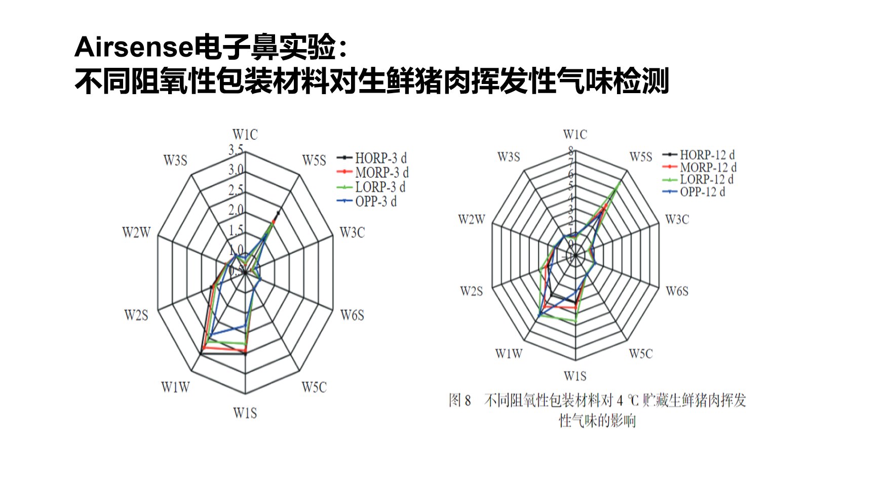 AIRSENSE電子鼻能夠通過揮發性氣味指紋快速區分不同阻氧包裝對生鮮豬肉的保鮮效果:高、中阻氧包裝可顯著降低腐敗(bài)揮發物生成,延緩風味劣變(biàn);低阻氧與透氧包裝會加速硫化物、氮氧化物等異味物質積累,導緻肉品快速腐敗(bài)。AIRSENSE電子鼻可作爲包裝材料篩選、肉品新鮮度快速評價與貨架期預測的高效技術,爲生鮮肉保鮮包裝研發與品質管控提供可靠支撐。