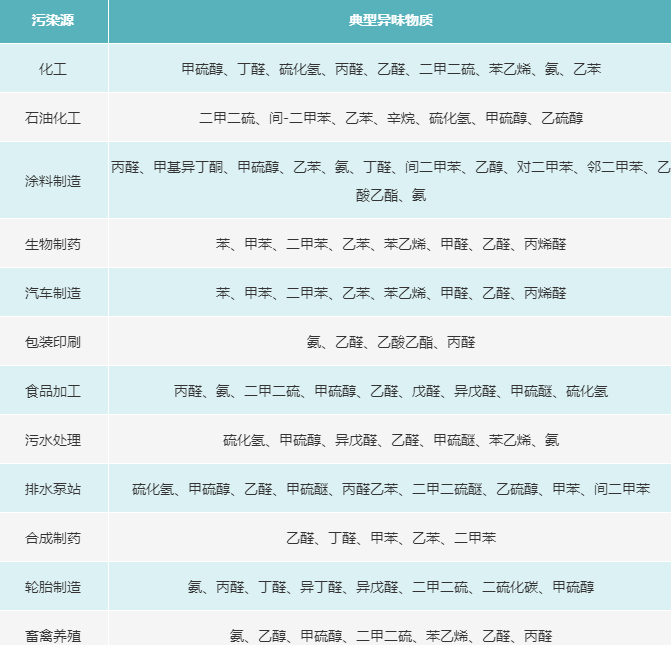 人工發生源可分爲三類:農牧業污染源、城市公共設施污染源和工業污染源。農牧業污染源主要爲畜牧場、家禽飼養場、屠宰廠、水産加工廠等産生的異味,如糞臭、魚臭、爛果臭、野菜臭等等。城市公共設施污染源主要爲垃圾填埋場、污水處理廠、垃圾焚燒廠、醫院、公廁(cè)等産生的異味,如污水臭、垃圾腐敗(bài)臭、糞尿臭等。工業污染源主要來自人類的工業生産過程,如石油及天然氣的精煉廠、生物制藥廠、染料化工廠、焦化廠、制革廠、紙漿廠、食品廠等。通常工業生産所産生的惡臭物質較爲集中,影響較大,典型污染源的主要異味物質如下表所示。