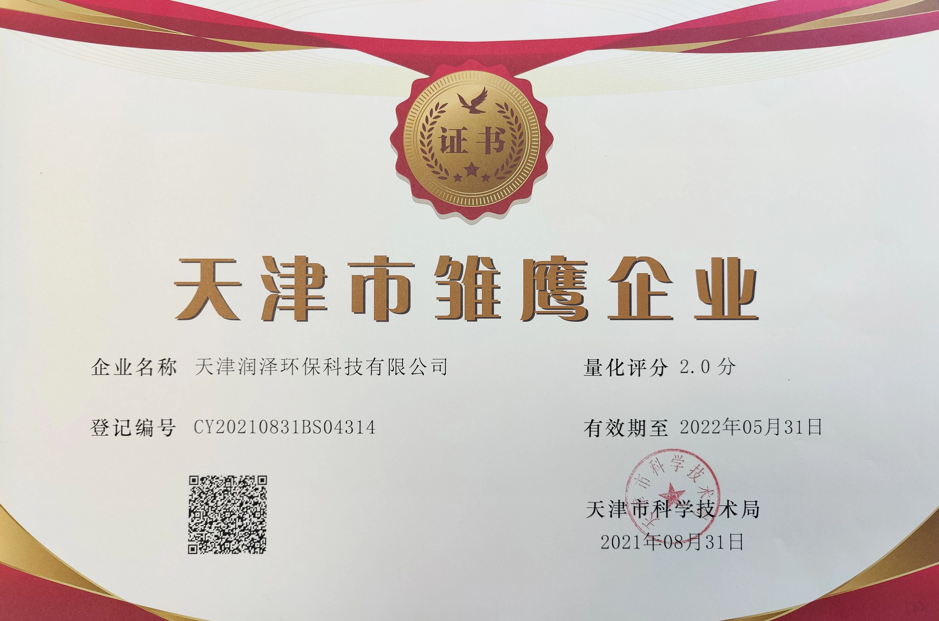 近日,天津市科學技術局公示瞭2021年天津市“雛鷹計劃”企業認定名單,天津潤澤環保科技有限公司(以下簡稱“天津潤澤環保”)榮獲“2021年度天津市雛鷹企業”稱号。
